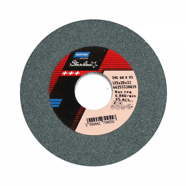 A Norton Starline 39C jelű asztali és állványos köszörűkhöz való korongok a leggyakrabban használt méretekben, csiszolóanyag-típusokban és szemcsézetekben kaphatók. Éles nagytisztaságú sziliciumkarbid (Crystolon) szemcséből készül. Ez a legtörékenyebb csiszolóanyag. Preciziós tervezésű szemcseméretek a megfelelő kötés keménységgel párosítva. Maximalizált vágóképesség minden nem vas tartalmú anyaghoz, alkalmas színesfémek, öntöttvas, alumínium, sárgaréz, bronz, könnyűfémek, réz, titán, vídia és keményfém szerszámok, valamint üveg és műanyagok megmunkálására. Ideális nagy pontosságú köszörülési és élezési műveletekhez.   Termék információk: Gyártói cikkszám: 66253338039Alakjel: 01Méret: Ø125x20x32 mmSpecifikáció: Szemcse típus/Méret/Keménység/Kötés : 39C 60 K VSMax. vágási sebesség: 45 m/sCsomagolási egység: 2 db/csomag video type="youtube" width="480" height="270" autoplay="0"https://www. youtube. com/watch?v=ztyW4zS9-PA&t/video