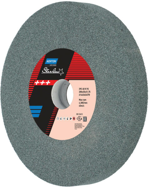 A Norton Starline 39C jelű asztali és állványos köszörűkhöz való korongok a leggyakrabban használt méretekben, csiszolóanyag-típusokban és szemcsézetekben kaphatók. Éles nagytisztaságú sziliciumkarbid (Crystolon) szemcséből készül. Ez a legtörékenyebb csiszolóanyag. Preciziós tervezésű szemcseméretek a megfelelő kötés keménységgel párosítva. Maximalizált vágóképesség minden nem vas tartalmú anyaghoz, alkalmas színesfémek, öntöttvas, alumínium, sárgaréz, bronz, könnyűfémek, réz, titán, vídia és keményfém szerszámok, valamint üveg és műanyagok megmunkálására. Ideális nagy pontosságú köszörülési és élezési műveletekhez.   Termék információk: Gyártói cikkszám: 61463626372Alakjel: 01Méret: Ø200x25x31,75 mmSpecifikáció: Szemcse típus/Méret/Keménység/Kötés : 39C 100 K VSMax. vágási sebesség: 45 m/sCsomagolási egység: 2 db/csomag video type="youtube" width="480" height="270" autoplay="0"https://www. youtube. com/watch?v=ztyW4zS9-PA&t/video